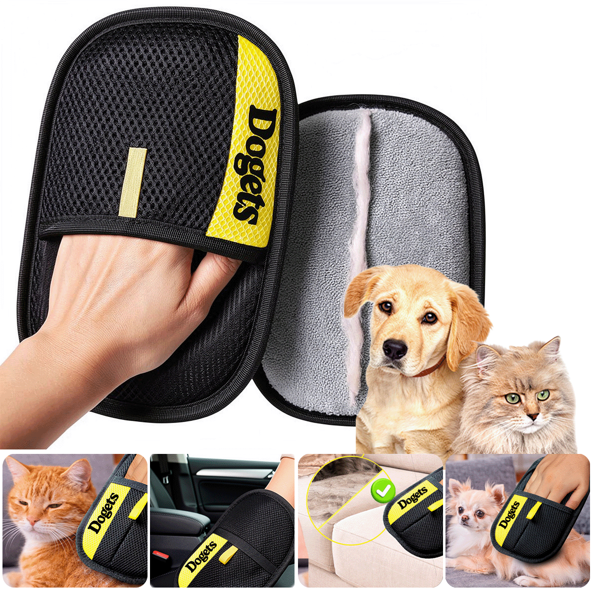 A Luva Tira Pelos Dogets é a solução prática e rápida para remover pelos de roupas, sofás, camas, carpetes e até do próprio pet. Utilizando tecnologia eletrostática, ela atrai fios soltos com facilidade, sem precisar de energia, refis ou adesivos. Leve, portátil e reutilizável, é ideal para o dia a dia de quem convive com cães e gatos.